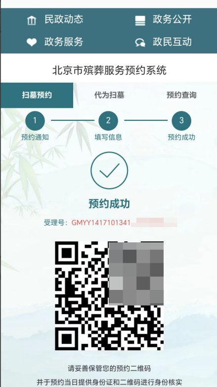 预约人祭扫预约成功后,系统将自动生成二维码,待祭扫入园时出示检验,如下图所示: