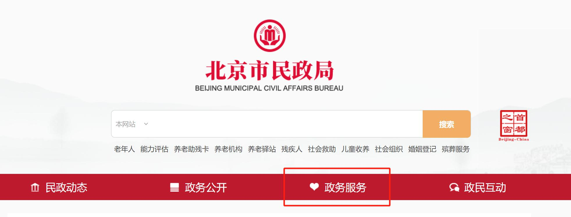 您可以访问网址“https://mzj.beijing.gov.cn/”进入北京市民政局门户网站,点击“政务服务”按钮。如下图所示: