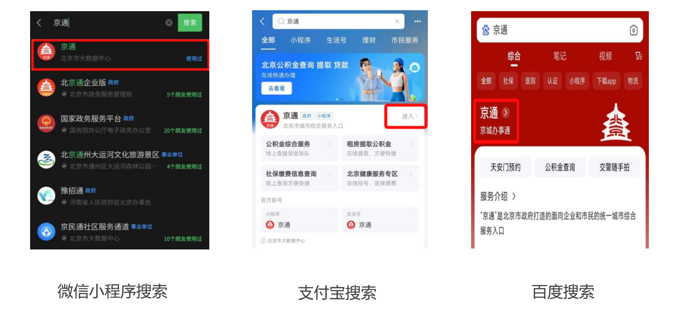 可通过微信小程序、支付宝、百度等,搜索“京通”关键字进入,如下图所示: