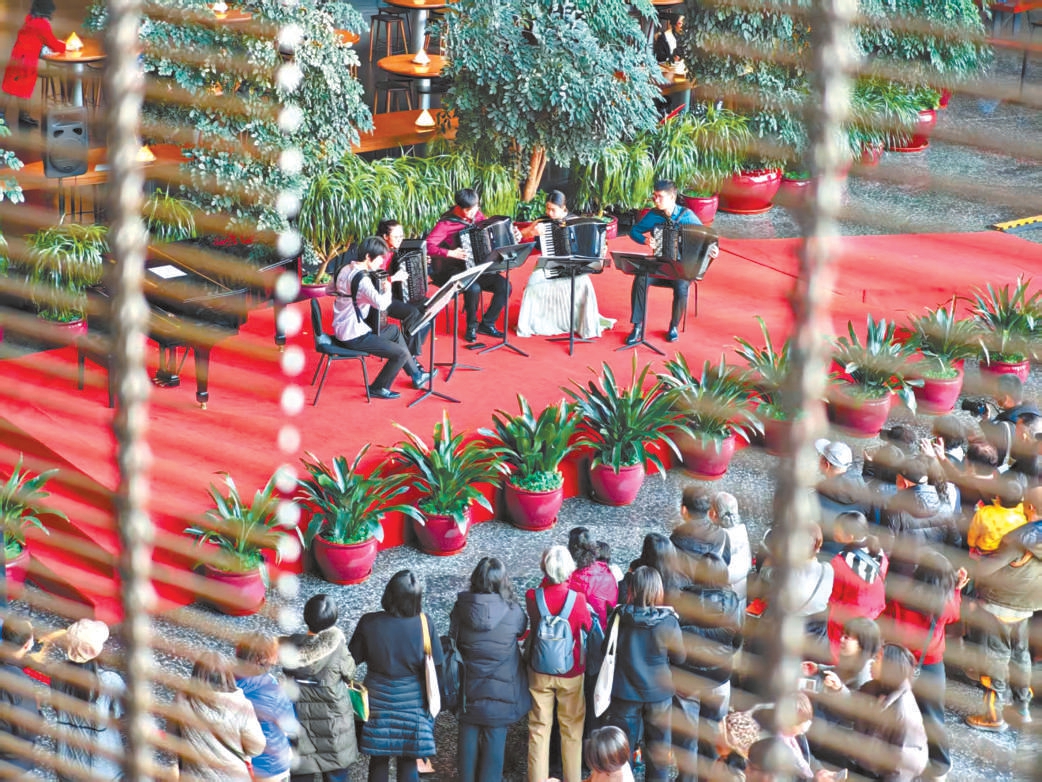 观众欣赏在国家大剧院公共空间内上演的各类演出。(方非 摄)