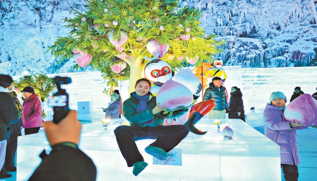 今年艺术节以“龙庆传奇,致敬经典”为主题,将动画片《大闹天宫》的经典场景搬入冰雪世界。13.6米高的“南天门”、威严的“四大天王”、生动的“马上封侯”……步入展区,人们看到冰与雪也能如此栩栩如生、流光溢彩。