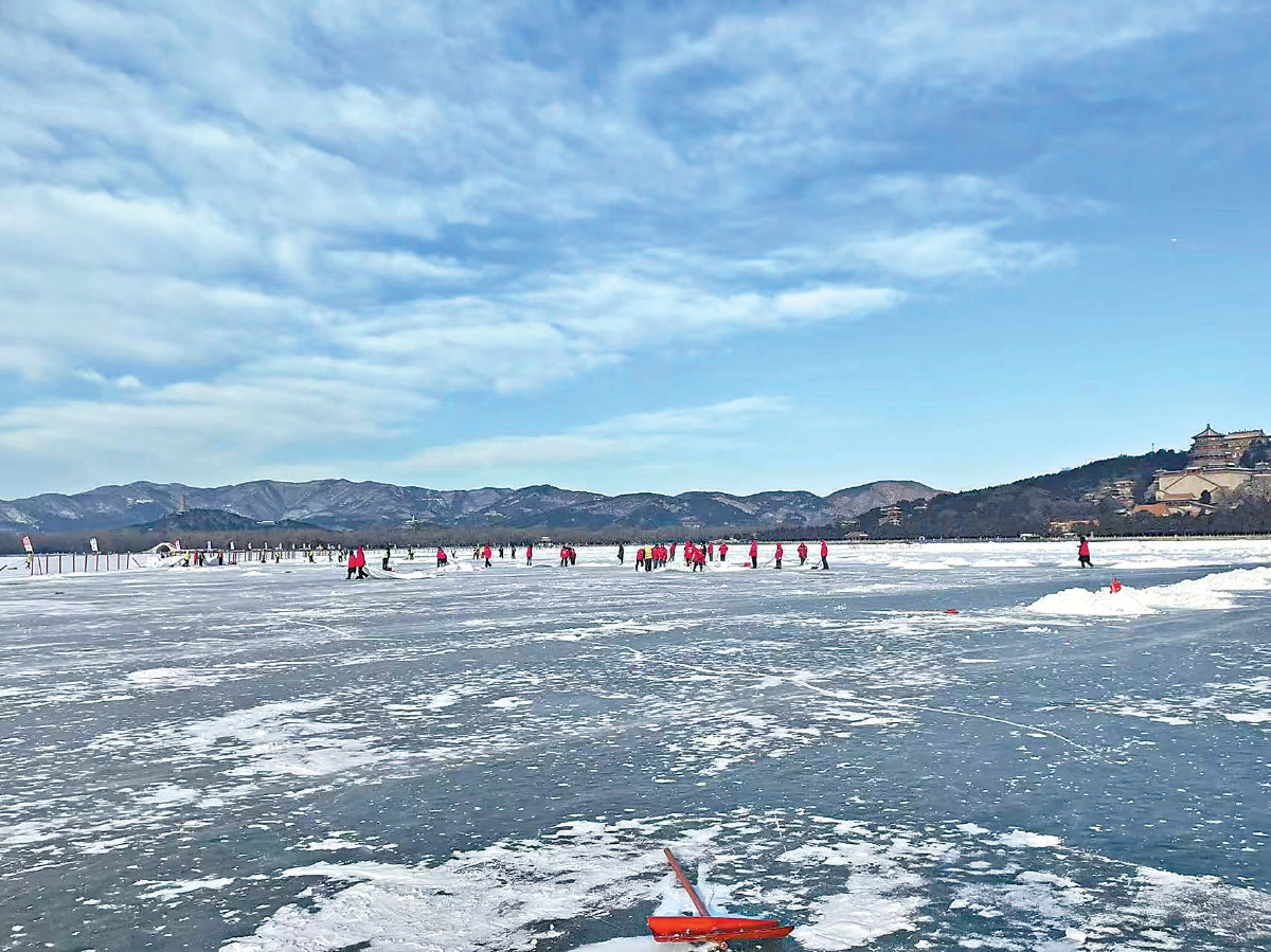 颐和园工作人员紧锣密鼓清理昆明湖冰场积雪。(吴镝 摄)