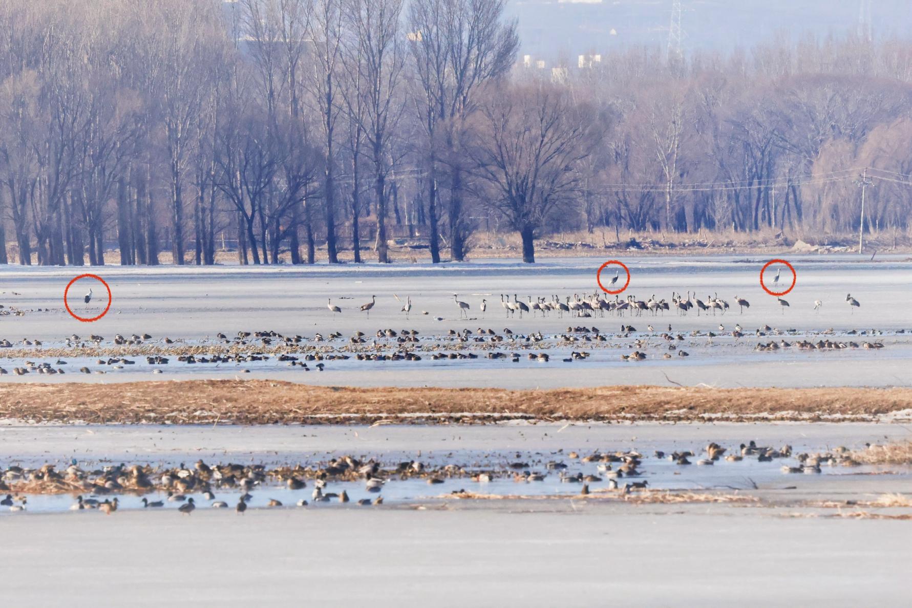 东方白鹳(左一红圈内)、白枕鹤(左二、右一红圈内)与灰鹤等雁鸭类一起觅食栖息。延庆自然保护地供图