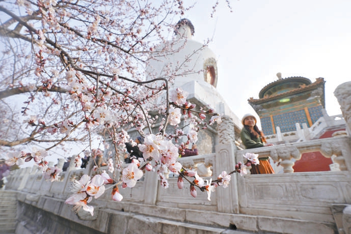 在北海公园琼华岛看到,白塔脚下的山桃花已悄然盛放,京城早春盛景“白塔映桃花”的经典画卷如期而至。(代丽丽)