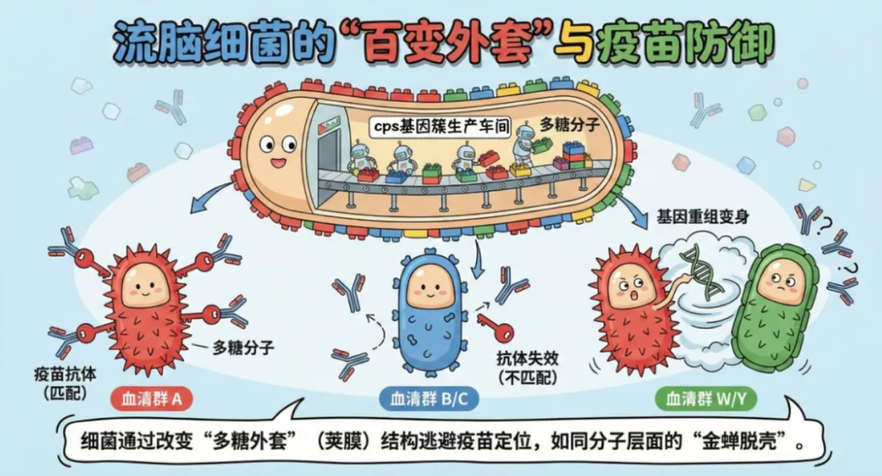 流脑细菌非常聪明,它不仅会自我进化,还会偷偷学习其他细菌的“穿搭指南”。它能修改自己的“工厂图纸”,在短时间内把外套从“A款”换成“C款”。这种“分子级别的换装”让它能反复躲避抗体的围剿。