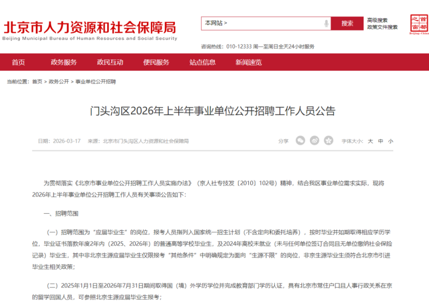 为贯彻落实《北京市事业单位公开招聘工作人员实施办法》(京人社专技发〔2010〕102号)精神,结合我区事业单位需求实际,现将2026年上半年事业单位公开招聘工作人员有关事项公告如下: