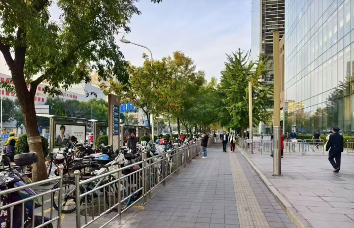 在商场治理方面,西城区继2025年对西直门凯德茂实施流线优化、新增停车设施、基本实现停车供需平衡后,今年持续深化治理举措,重点推进非机动车分区管理。该区对商场西侧停车空间进行改造升级,推行60°斜列停放方式,在保障车辆进出顺畅的同时,最大化利用现有空间。结合商场商户布局与电梯点位,在凯德茂南门科学划定外卖车辆专用停放区;设置电动车分区停放指引标识,增设潮汐车位以动态匹配高峰时段停车需求,并通过色彩区分引导市民有序停放、规范通行,同步优化西侧非机动车通行流线,有效提升区域通行效率与停放秩序。