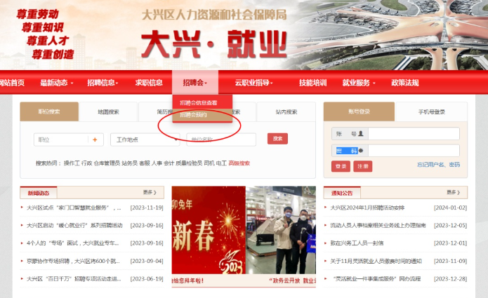 第一步:打开“大兴就业平台”(http://jy.daxing.net),登录后,点击导航栏“招聘会”下拉菜单中的“招聘会预约