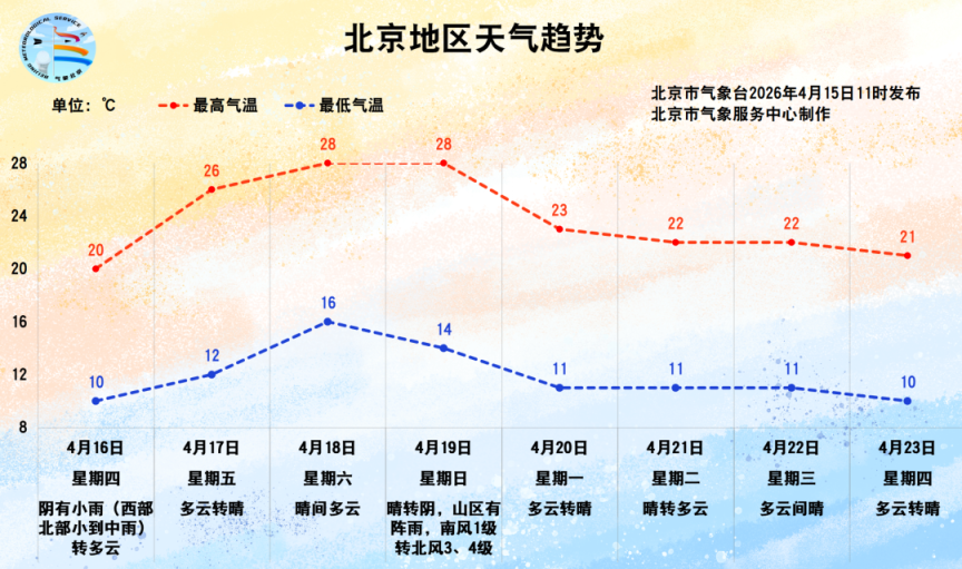 16日(周四)白天:阴有小雨,西部北部小到中雨;北转南风2~3级;平原地区最高气温20℃,山区最高气温16~20℃;最小相对湿度40%。
