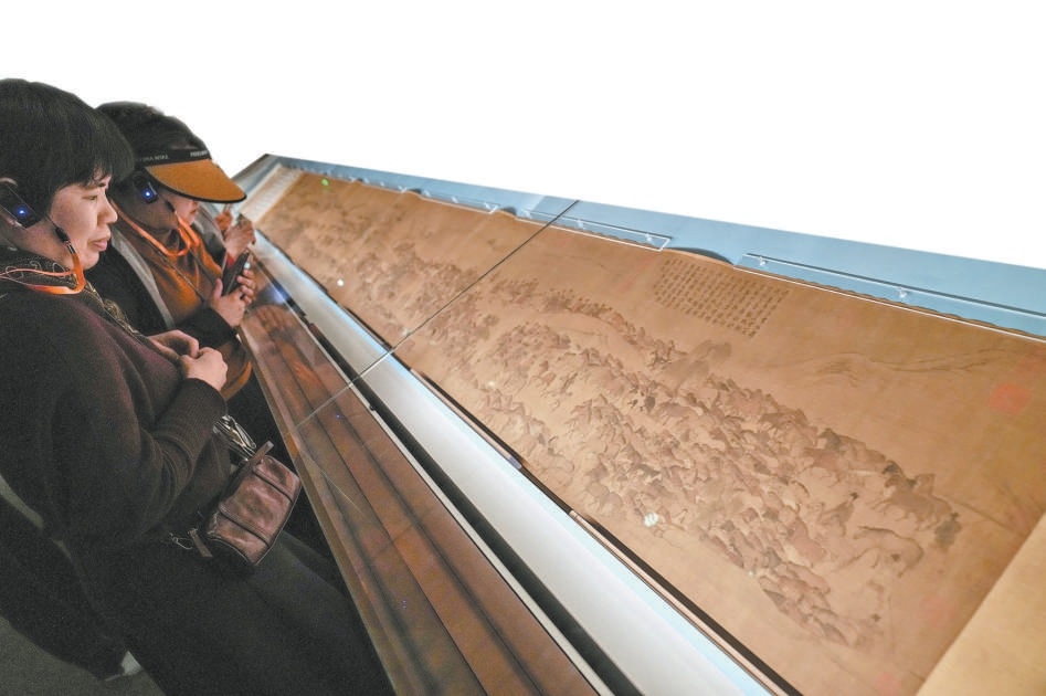 展厅内,参观者在宋代李公麟《摹韦偃牧放图》卷前驻足。(武亦彬 摄)