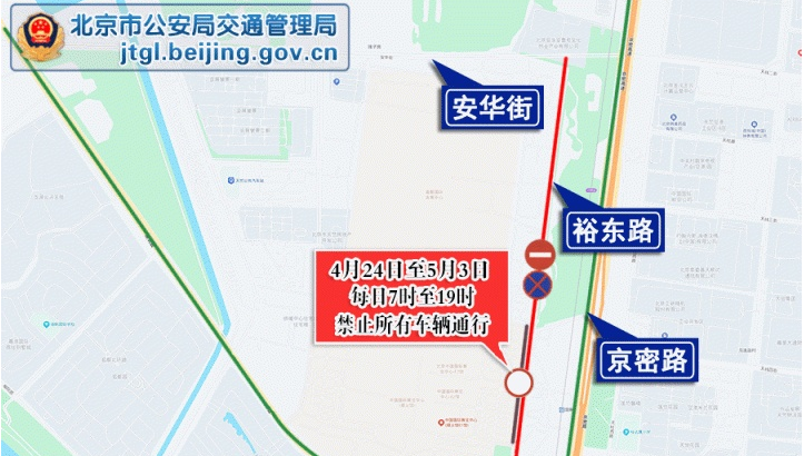 二、4月24日至5月3日,裕安路(中国国际展览中心5号门至安华街)路段、裕丰路(天北路至安华街)路段、安华街(裕丰路至京密路)路段,根据车辆流量及通行情况,适时采取交通管理措施,社会车辆可绕行天北路、安宁大街。