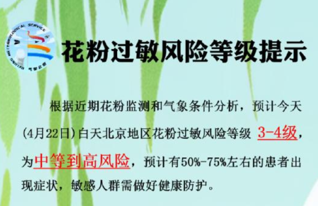据近期花粉监测和气象条件分析,预计4月22日白天北京地区花粉过敏风险等级3-4级,为中等到高风险,预计有50%-75%左右的患者出现症状,敏感人群需做好健康防护。