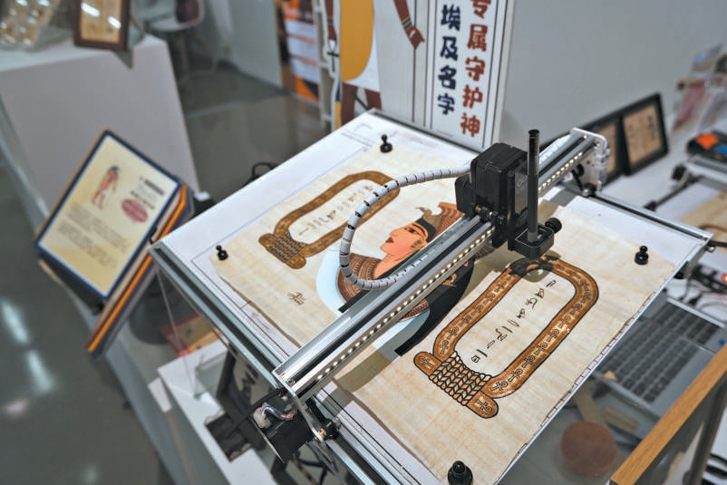 在遇见博物馆展区,会“写字”的机器人吸引不少目光。工作人员介绍,机器人写下的圣书体是七千年前世界上最早的象形文字,“观众可以选择喜欢的莎草画图样,然后写下想书写的名字,就能体验机器人现场书写圣书体名字,带走一份专属的埃及特色文创礼物。”