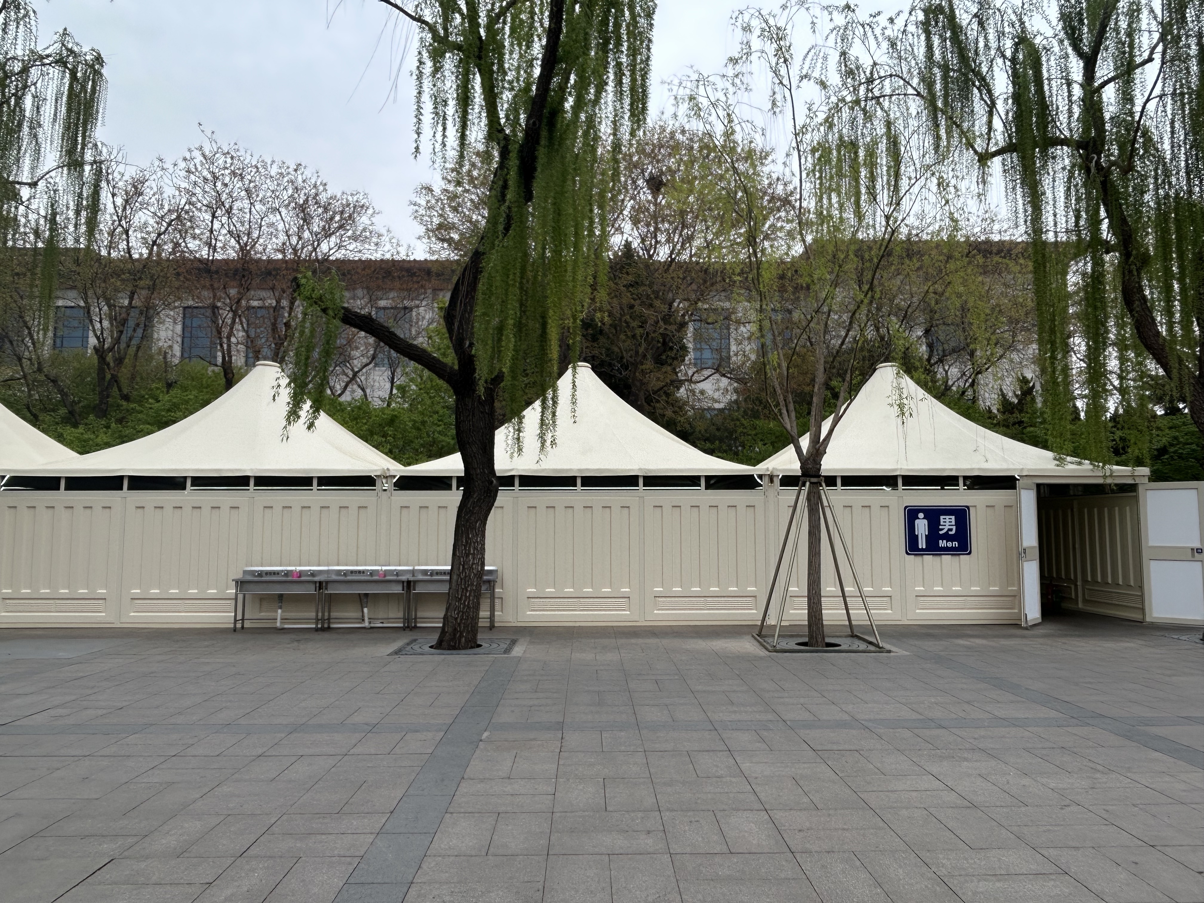 在国家博物馆西侧,远远望去,5座帐篷式临时厕所排列整齐,统一的米黄色外观与周边建筑物的外立面非常协调。