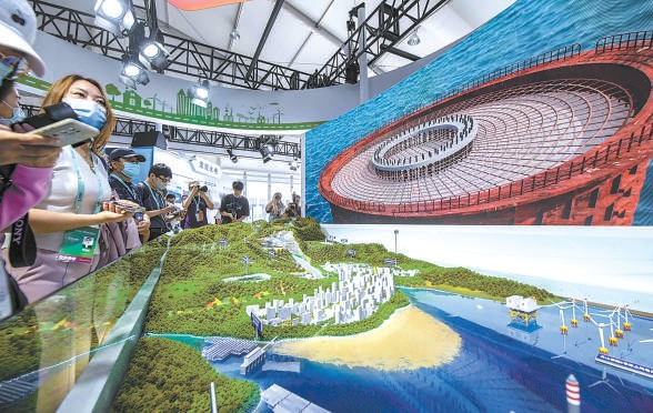 在中国电力建设集团展厅正中央的是该集团的项目沙盘,从沙盘上可以清晰地看到,风电机组不仅坐落在草原、戈壁等内陆,还建在海洋深处。(潘之望 摄)