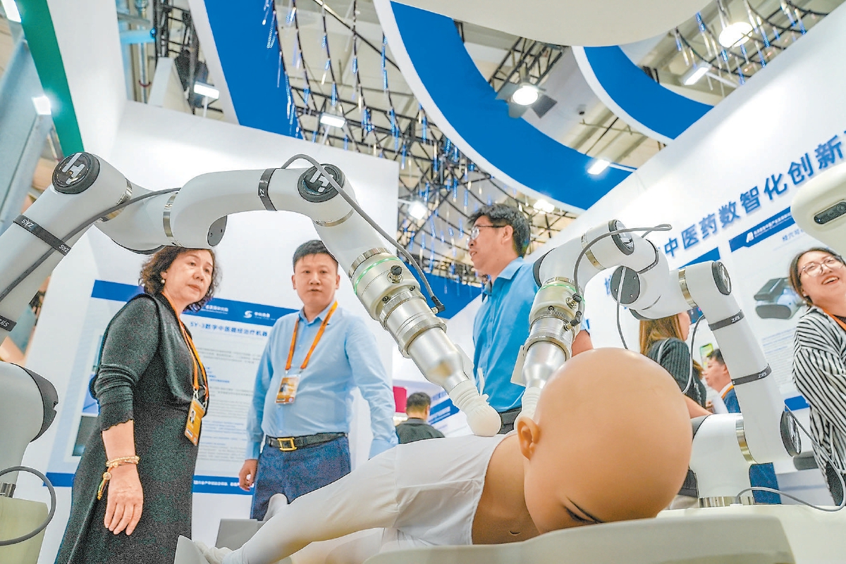 在服贸会健康卫生服务专题展区,一台自动循经护穴的中医机器人吸引参观者驻足了解。