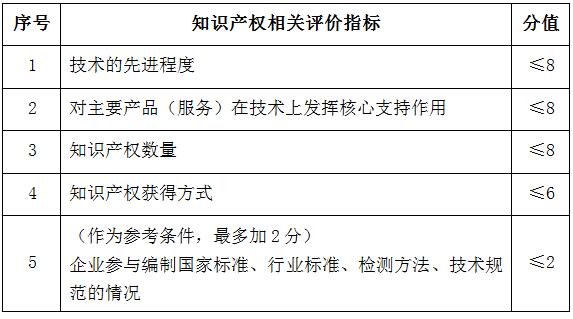 企业创新能力主要从知识产权、科技成果转化能力、研究开发组织管理水平、企业成长性等四项指标进行评价。各级指标均按整数打分,满分为100分,综合得分达到70分以上(不含70分)为符合认定要求。四项指标分值结构详见下表: