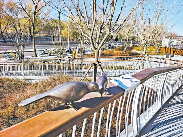 冬日午後,昆玉河水靜靜流淌,河東岸玲瓏路與藍靛廠南路交叉路口南側綠地中,休閒廊道蜿蜒向前。沿廊道漫步,不時就遇小“驚喜”:金鸻鳥、黑臉噪鹛、紅頸濱鷸……一組組“銅雀”立在扶手上,胖胖的,邊上還有銘牌介紹。來到懸空的“塔影臺”遠眺,慈壽寺塔在望。近處,孩子們在游樂設施的網繩區攀爬,老人在健身器材處鍛煉。