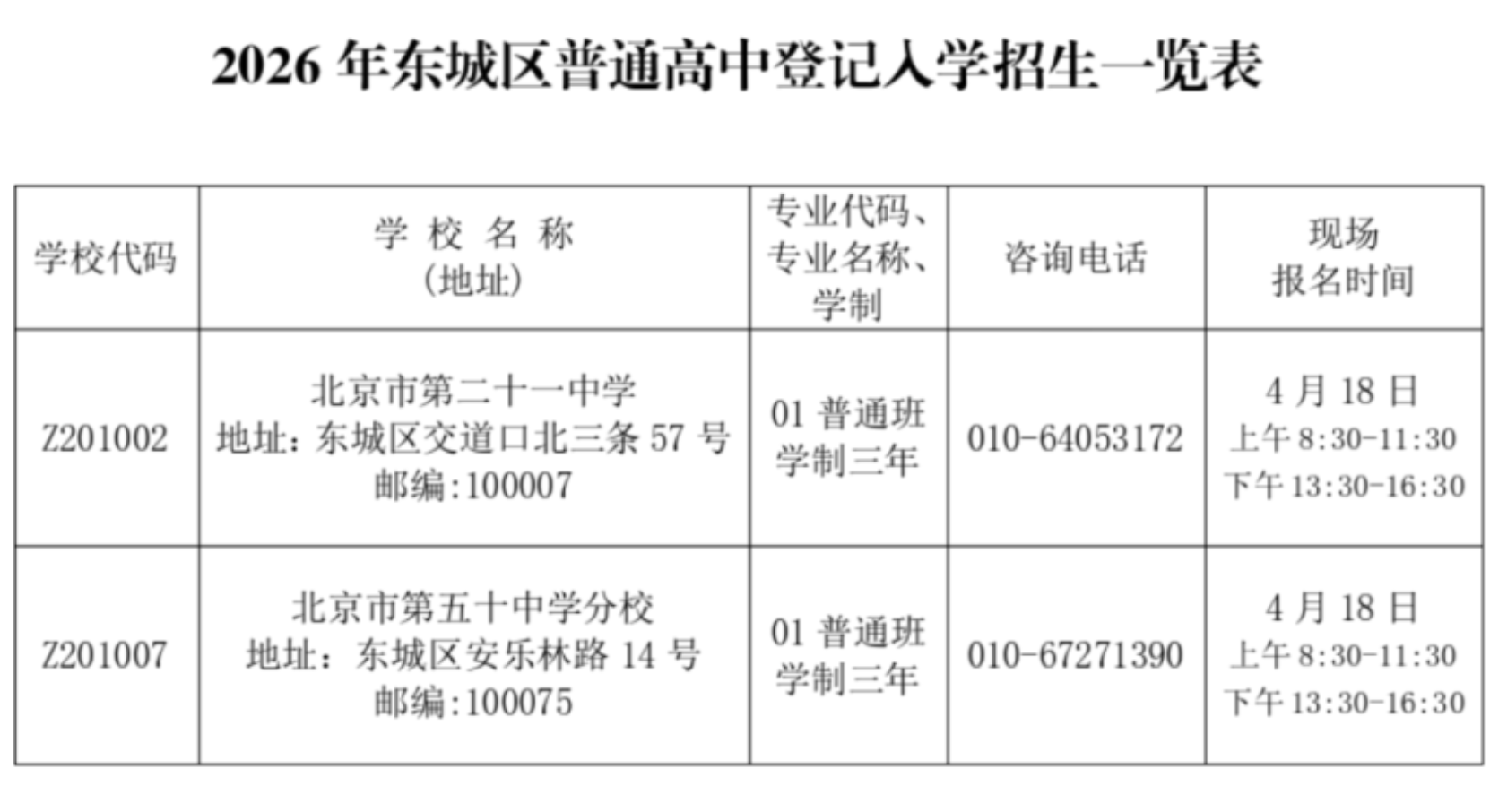 北京市第二十一中學,登記入學計劃為80人;北京市第五十中學分校,登記入學計劃為80人。