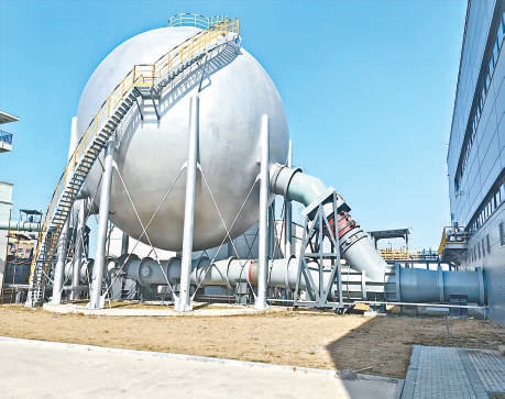 在曹妃甸區跨介質科學與系統研究院,數組灰色高壓氣罐和中壓氣罐整齊排列在院子裏,最引人注目的是巨大的球狀負壓吸氣球體設備——真空球,銀色的球體和粗大的連接管道在陽光下泛著光。