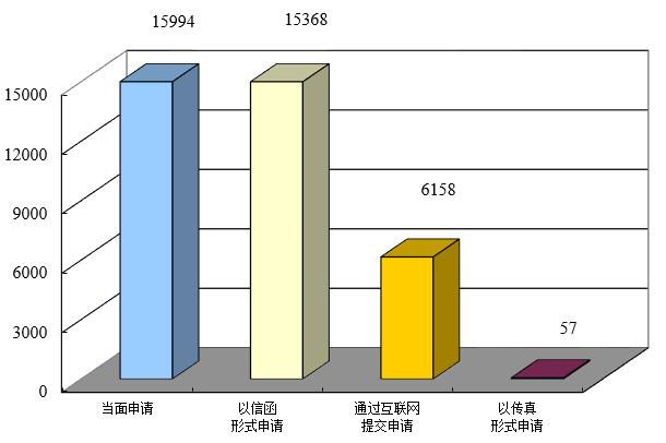 全市申請總數為37499件。申請方式中,當面申請15994件,佔總數的42.65%;以傳真形式申請57件,佔總數的0.15%;通過網路提交申請6158件,佔總數的16.42%;以信函形式申請15368件,佔總數的40.98%。(因同一申請可以多種申請方式提出,故分類申請之和大於申請總數。)
