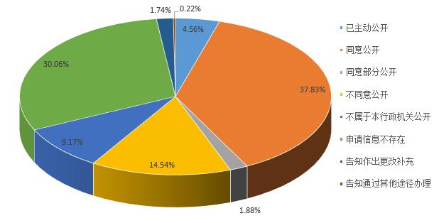 已答覆的34226件申請中:"屬於已主動公開範圍"1563件,佔總數的4.56%;"同意公開"12949件,佔總數的37.83%;"同意部分公開"642件,佔總數的1.88%;