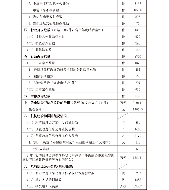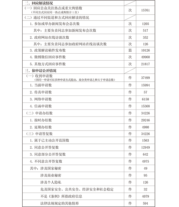 全市37499件申請辦結數為34226件,其中按時辦結數29246件,延期辦結數4980件。其餘未到答覆期的按照《中華人民共和國政府資訊公開條例》時限規定在2018年答覆。