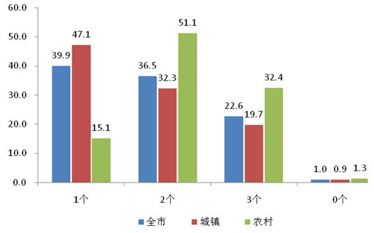 調查顯示,被訪老人有1個子女的佔39.9%,有2個子女(含)以上的佔59.1%,另有1.0%無子女。從城鄉分組看,城鎮老人有1個子女的比例為47.1%,高於農村32.0個百分點,超8成農村老人有2個(含)以上子女。