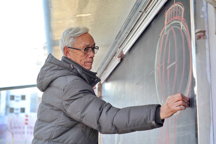 大峪街道月季園二區裏很安靜,一切似乎還像是在過年。曹雍慢慢走到社區入口處的黑板前,放好東西,直起腰,深吸一口氣,拿起粉筆,開始畫戊戌年開年第一期黑板報。
