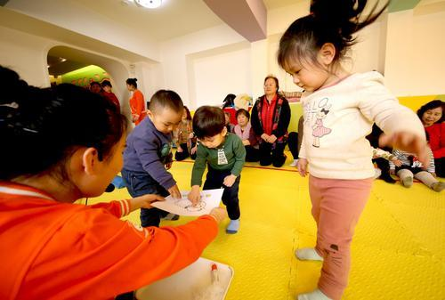 孩子們在專業早教老師的帶領下,一起做遊戲。喬建攝