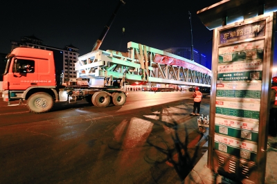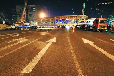 從昨夜到今晨,東單路口南側天橋正式進入主梁吊裝工程。到今晨4點,主梁正式就位,接下來工程還會進行梯道安裝、橋面鋪設的工作。預計到2018年1月中下旬,兩座天橋將正式投入使用。