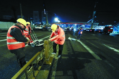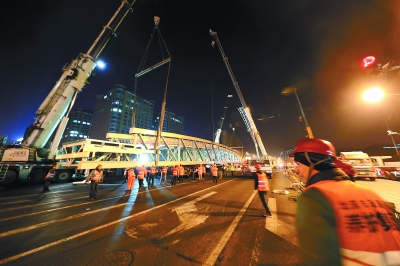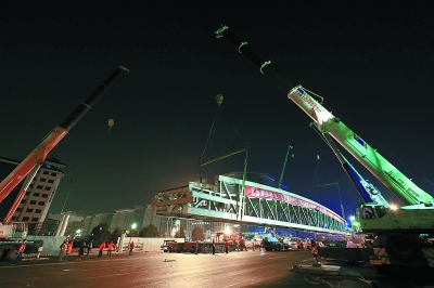 賈海賓介紹,在南側天橋完成吊裝後,今晚到明天凌晨還將進行北側天橋的吊裝,隨後還會進行梯道安裝、橋面鋪設的工作。預計到2018年1月中下旬,兩座天橋將正式投入使用。