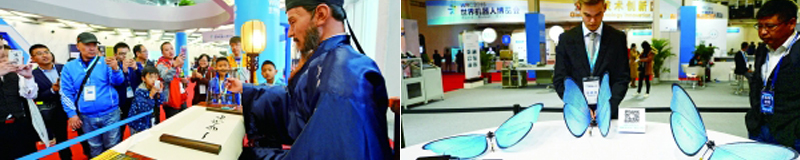 10月20日,機器人大會的博覽會率先登場,展示工業、服務、特種機器人以及智慧機器人在工業、農業、服務業等方面的應用。在工業展區,各種靈活自如的大機器人展示著工業生産線上的看家本事。而三隻飄飄飛舞的藍色大蝴蝶顯得與眾不同,翅膀輕盈透明、姿態優美。這就是被稱為史上顏值最高的倣真“無人機”機器蝴蝶。