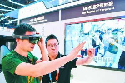 在2019年京交會會場,觀眾體驗結合5G網路技術的MR天宮2號對接模型。鄧偉攝
