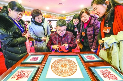 2019年1月13日,“為民族傳承,為生活創新——北京市非物質文化遺産保護工作成果展”在市十五屆人大二次會議代表駐地舉行,非遺傳承人為代表們展示剪紙技藝。武亦彬攝