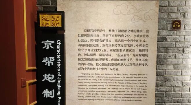 北京中藥炮製技術博物館又被稱為“京幫炮製博物館”,位於華邈藥業科研樓一層。博物館圍繞“歷史追溯”“技術傳承”“京幫集粹”和“國藥圖鑒”四個主題,展示了京藥宮廷御用、修事精益、安全有效的深厚底蘊。