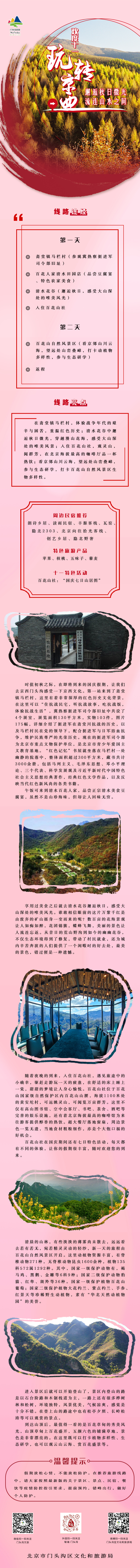 線路途經:第一天:齋堂鎮馬欄村(參觀冀熱察挺進軍司令部舊址)→百花人家清水田園店(品嘗豆腐宴、特色農家美食)→清水花谷(邂逅秋日,感受大山深處的唯美風光)→入住百花山社;