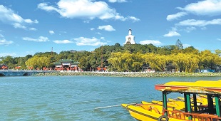 10月9日,京城秋高氣爽,北海公園瓊華島白塔周圍秋意初現,景色宜人。(鄧偉 攝)