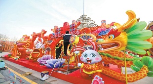 1月11日上午,亦莊博大公園的大型新春燈光裝置正在進行收尾工作。公園正門,栩栩如生的兔子、龍、獅子、金魚以及飄逸祥雲、五彩蓮花組合成的花燈組合十分搶眼,傳遞出濃濃的年味兒。(和冠欣)