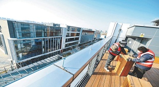 臨近春節,南海子體育休閒産業園項目即將竣工,園區正在做最後的施工衝刺,工人師傅在建築屋頂露臺佈置、裝修。 (和冠欣 攝)