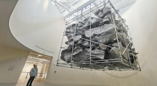 在展覽中,觀眾可以看到藝術家隋建國重達3噸的巨型雕塑《雲中花園·34個瞬間》,他從羅丹晚年的小泥塑作品中獲得靈感,在抓握泥巴等過程中使其複製藝術家雙手的指紋和印痕,再與電腦程式員和鑄造工匠合作,將泥塑作品放大、自由組合併堆積。(王廣燕)
