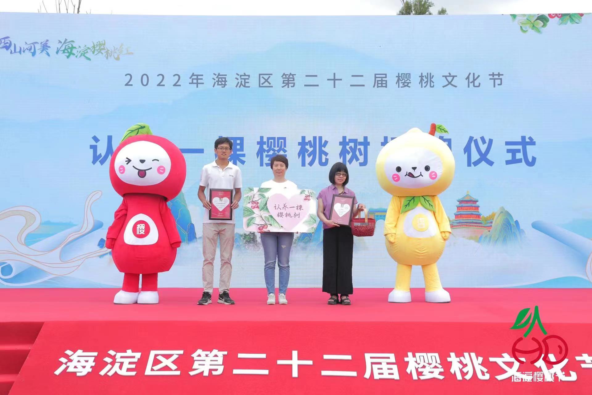 現場還有兩個名為“櫻紅”、“吧嗒”的卡通人偶格外引人關注,分別挎著裝滿新鮮櫻桃和杏的果籃,憨態可掬、人氣頗高。兩個卡通人偶的形象和名稱是以海淀櫻桃和獲得地理標誌認證農産品玉巴達杏為原型設計的,這也是兩名“代言人”首次公開亮相。