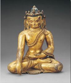此像結跏趺坐,頭飾螺發,頂現高內髻,戴五花冠,大耳垂肩。頭大面寬,額部高廣,眉眼上挑,眉間飾白毫相。脖子較短。肩部寬闊,胸肌高挺,軀體渾厚,四肢短粗,全身肌肉勁健有力。上身著袒右肩袈裟,下身著裙,衣紋採取薩爾納特式錶現手法,僅在領口、袖口、小腿及衣服下襬處用連珠線表現。整體造型大方,神態威嚴,氣勢恢宏,是一尊藝術特徵非常典型的元朝藏中地區造像。