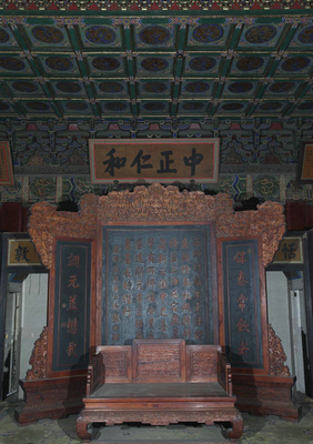 “中正仁和”匾為雍正帝禦題。屏風上“保泰常欽若、調元益懋哉”聯為乾隆帝禦題。