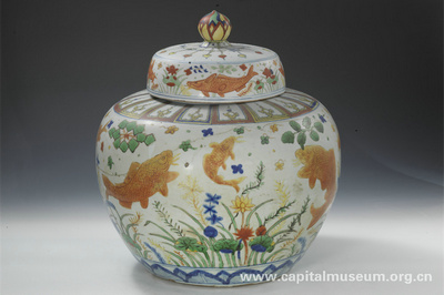 嘉靖款五彩魚藻紋蓋罐(明嘉靖)