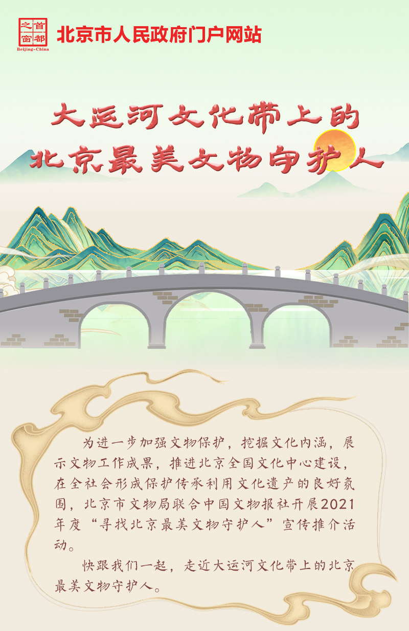 為進一步加強文物保護,挖掘文化內涵,展示文物工作成果。推進北京全國文化中心建設,在全社會形成保護傳承利用文化遺産的良好氛圍,北京市文物局聯合中國文物報社開展2021年“尋找北京最美文物守護人”宣傳推薦活動。讓我們一起走進大運河文化帶上的北京最美文物守護人,讓我們去聽聽他們的故事。