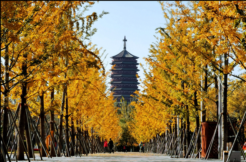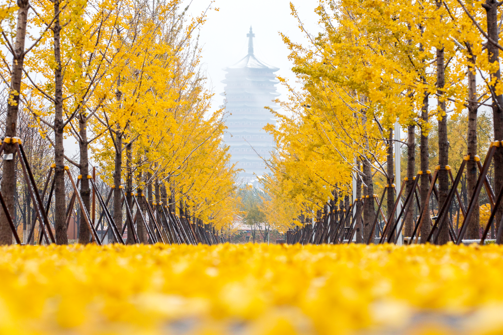 深秋的北京園博園,無疑是北京絕美打卡地。全長3公里、由800棵銀杏樹構建的銀杏大道,與古樸的高塔、遠處的青松,構成了一幅爛漫的秋日畫卷。