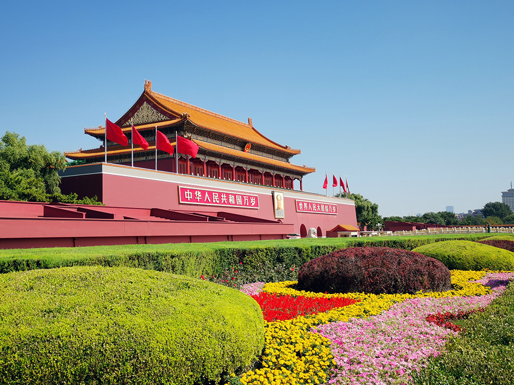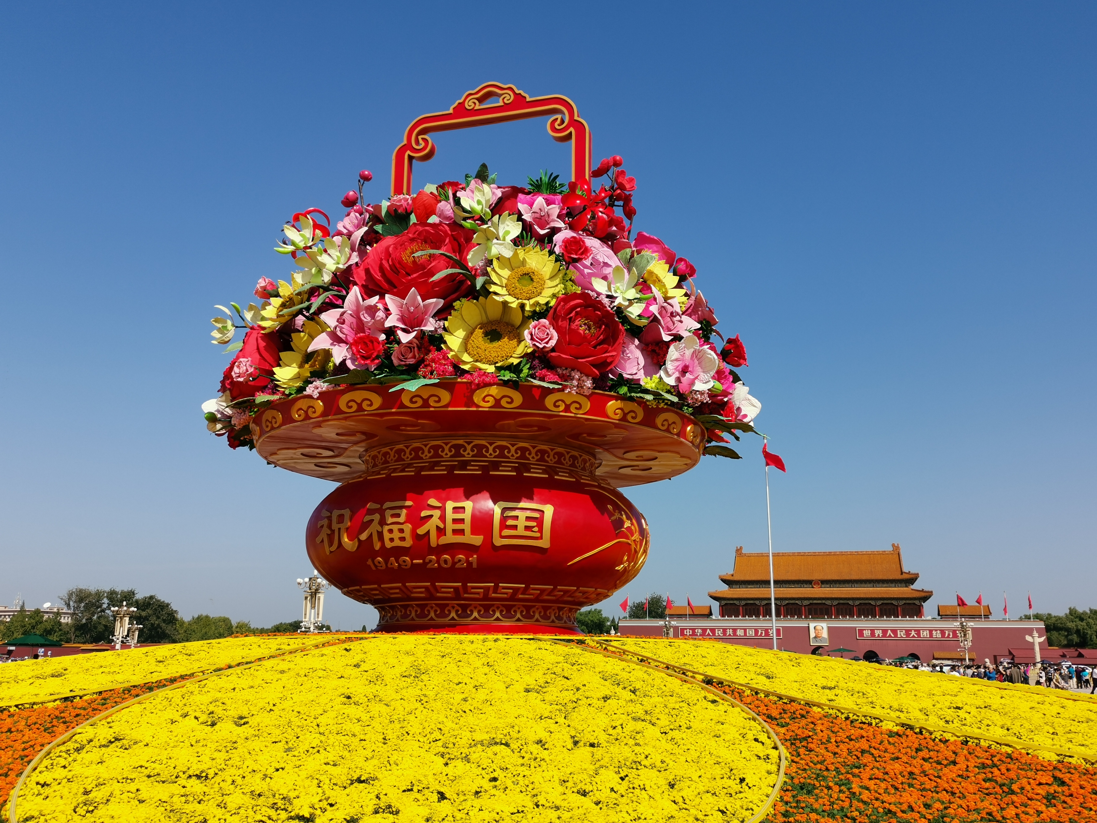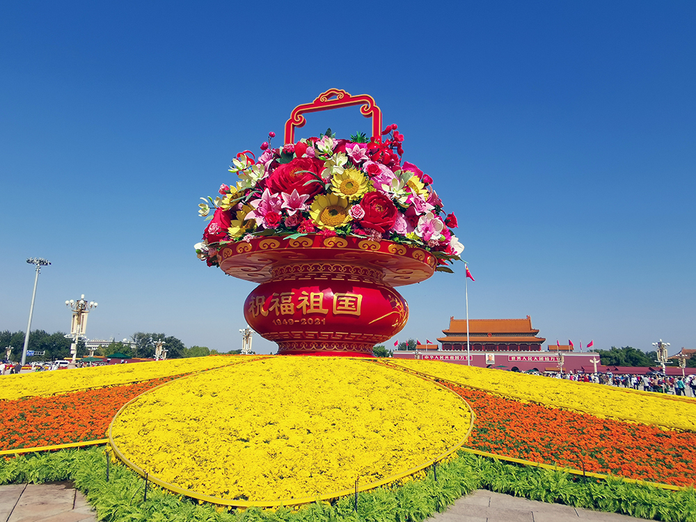 天安門廣場中心將佈置“祝福祖國”主題花壇,花壇頂高18米,以喜慶的花籃為主景。籃體南側書寫“祝福祖國,1949-2021”字樣,在籃體北側書寫 “歡度國慶,1949-2021”字樣。籃內採用了象徵紅心向黨、奮勇拼搏的向日葵、山丹丹、映山紅、紅梅及祝福祖國繁榮昌盛的牡丹、康乃馨等花卉,表達了全國各族人民緊密團結在以習近平同志為核心的黨中央周圍,意氣風發、砥礪前行,為實現中華民族偉大復興的中國夢而不懈努力。花壇底部直徑45米,為向日葵圖案,寓意朵朵葵花向太陽。(攝影:申炳成)