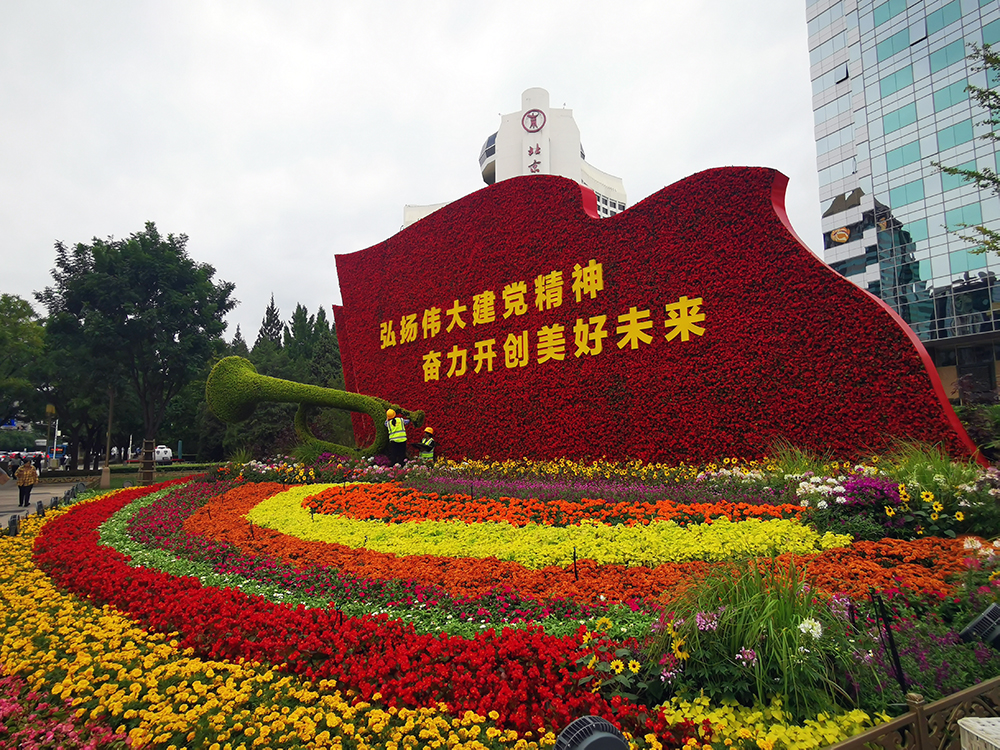 建國門西北角佈置“繼往開來”花壇,花壇頂高8米,以嵌有“弘揚偉大建黨精神,奮力開創美好未來”文字的紅旗為主景,寓意新時代領航者吹響繼續前進的嘹亮號角,走好新的趕考之路,開創更加美好的未來。(攝影:楊先燦)