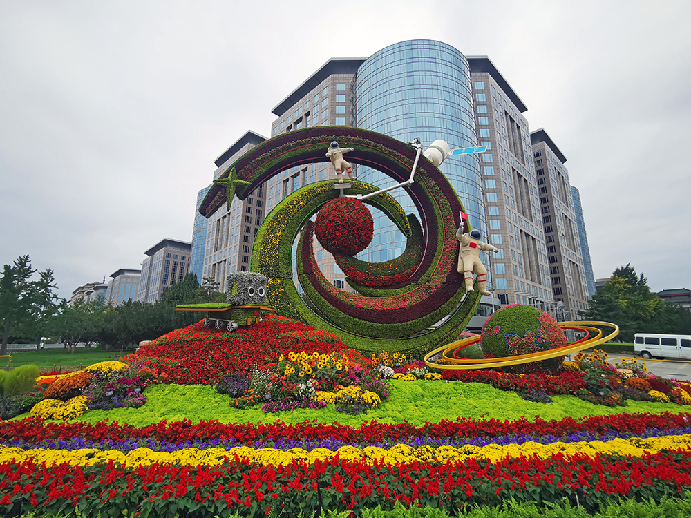 東單西北角花壇以“創新引領”為主題,花壇頂高8.5米,以中國宇航員探索太空奧秘為主景,配以空間站、“祝融號”火星車、機械臂等,生動展示通過科技自立自強,實現國家強盛。(攝影:楊先燦)